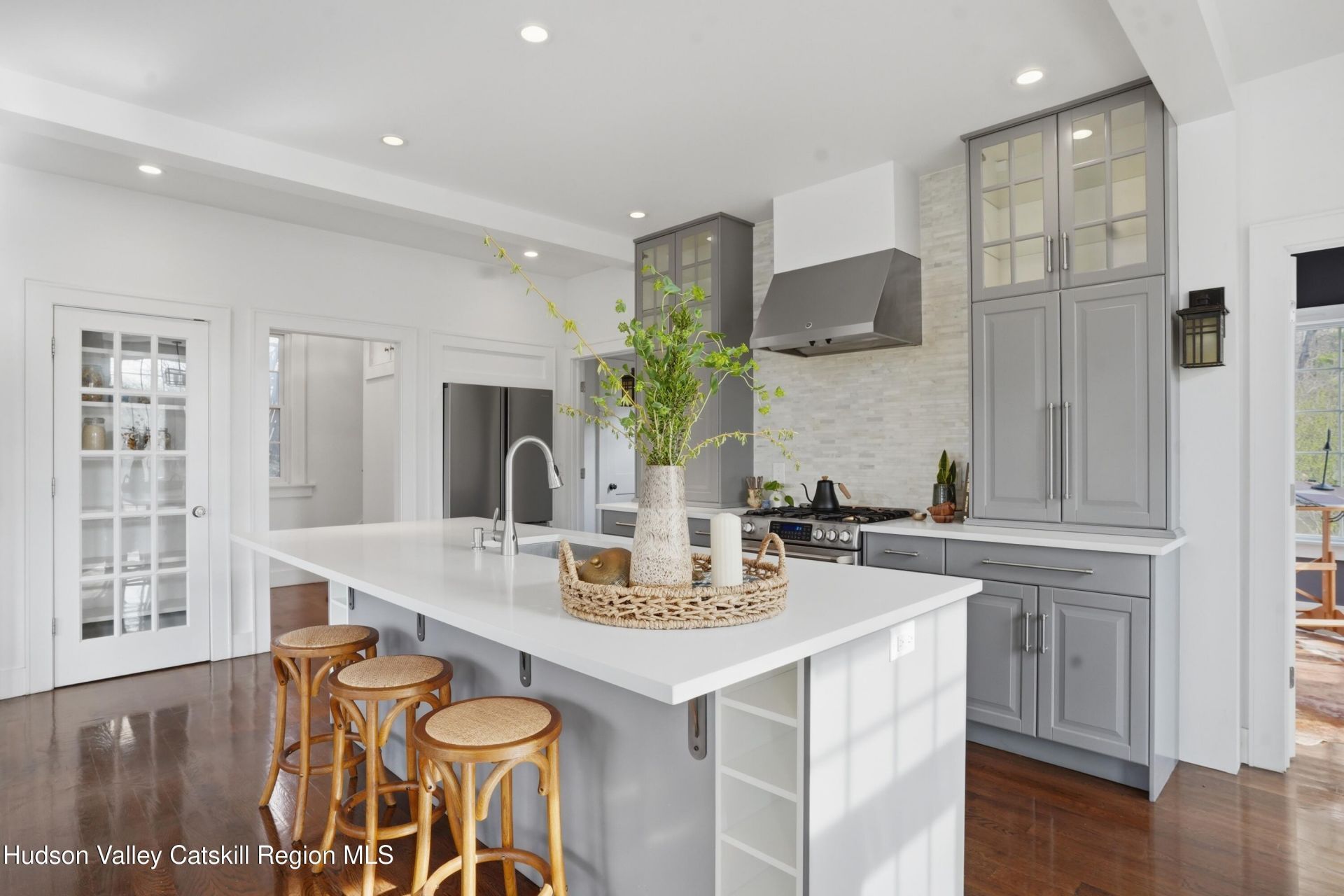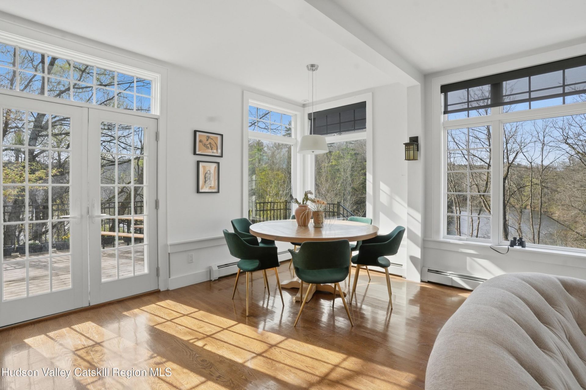 Spectacular Rondout Creek Views | Short-Term Rental Potential-Set along the banks of the Rondout Creek, this thoughtfully designed 3-bedroom, 2.5-bath home offers a rare combination of clean modern design and natural beauty--along with compelling income potential. Located in the sought-after hamlet of Rosendale, where there are currently no caps on vacation rentals, the next owner may explore obtaining a short-term rental permit, opening the door to both lifestyle and investment upside. A wall of windows frames the ever-changing landscape of the creek, bringing in light, movement, and the calming sound of rushing water. In warmer months, leafy greens create a sense of privacy and immersion. In winter, the view opens up, revealing the full expanse of the stream below as you gather by the fireplace. The main level is designed for both everyday living and effortless entertaining. An open floor plan seamlessly connects the kitchen, dining, and living spaces, anchored by a large island and sleek stainless steel appliances. Step directly from the dining area onto a terraced deck overlooking the water--perfect for morning coffee or long summer evenings. A bright office and half bath complete the first floor, offering flexibility for remote work or guest use. Upstairs, the creek-facing primary suite is a quiet retreat, with a spacious en-suite bath and elevated views of the water. Two additional bedrooms share a well-appointed full bath off the central hall, comfortably accommodating family and guests. The home features high-performance systems and materials throughout. Spray foam insulation, a high-efficiency propane boiler, central air, and a Navien on-demand hot water system work together to provide year-round comfort and energy efficiency. Outdoor living is just as considered. A lower stone patio sits close to the waters edge, where the gentle current becomes your soundtrack, while the upper deck--with a premium retractable awning--offers a more expansive setting for dining and gathering. Raised beds in the fenced in garden are ready for planting. Located just 90 miles from NYC, youre close to trailheads, cafes, the Rosendale Theatre, and the weekend farmers market, with easy access to Kingston, Woodstock, and Rhinebeck beyond. Whether youre looking for a weekend escape, a full-time residence, or a turnkey investment, this is a home where design, setting, and lifestyle align.